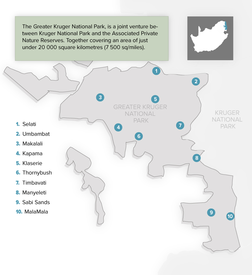 The Greater Kruger National Park is made up of over twenty private game reserves that span across 180 000 hectares. The most popular game reserves include: Timbavati, Thornybush, Manyeleti, Klaserie, Kapama and Sabi Sand Game Reserves.