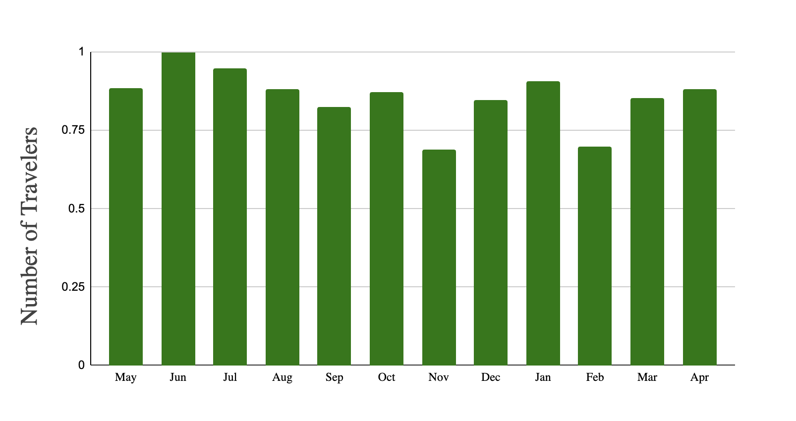 It started from data that tracks how many SAFARI.COM guests are traveling anywhere in Africa on a given day—from Cape Town right up to Uganda and Rwanda. It’s a broad-brush view, so it won’t tease out regional nuances, yet it clearly shows when demand crests and ebbs. We smoothed out the data to monthly traveled bookings in the graph above.