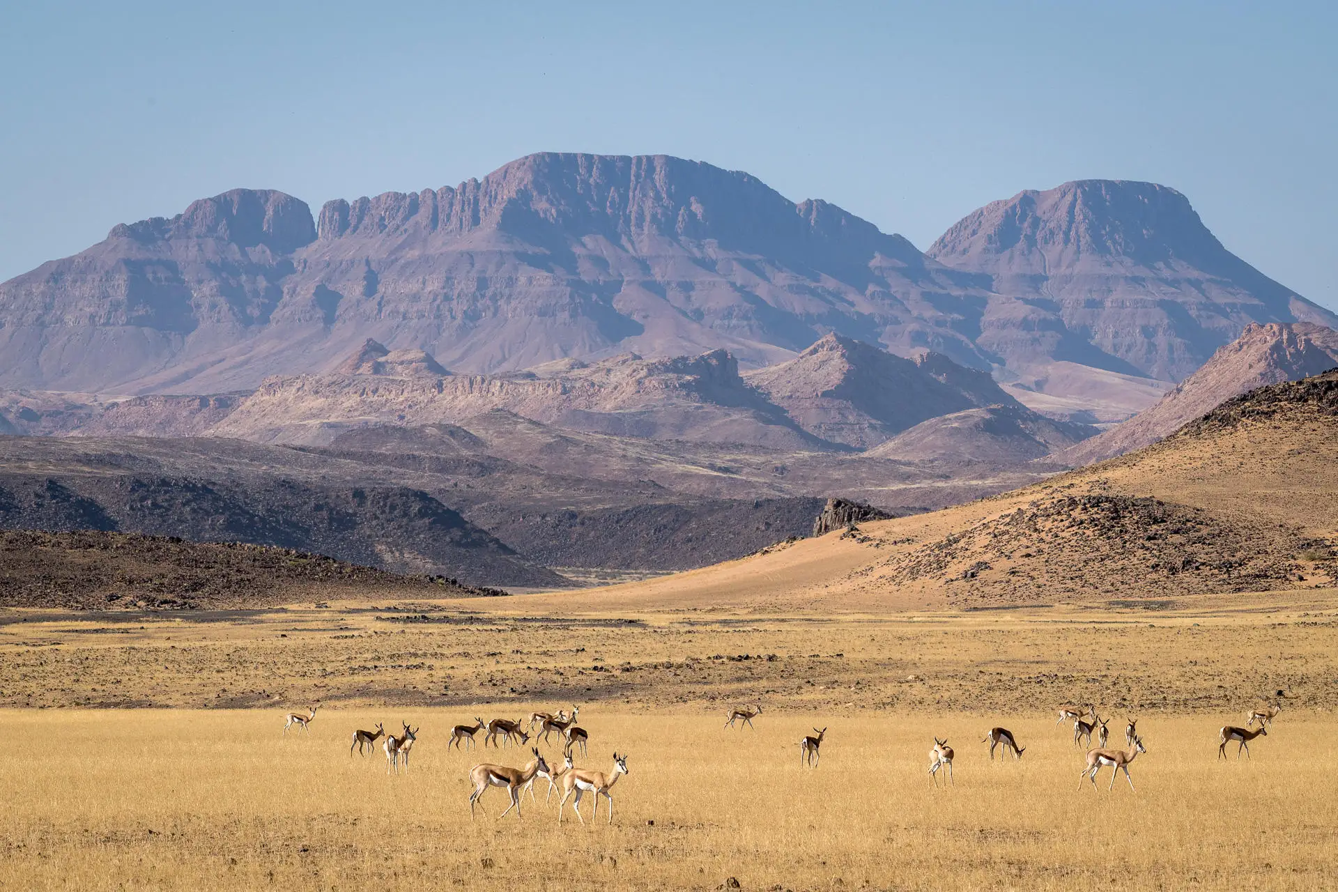 The region boasts wildlife that has evolved incredible methods to survive the extreme climate of Namibia. Here you will spot desert-adapted wildlife such as elephants, black rhinos, giraffes, oryx, and more as they navigate the rugged terrains.