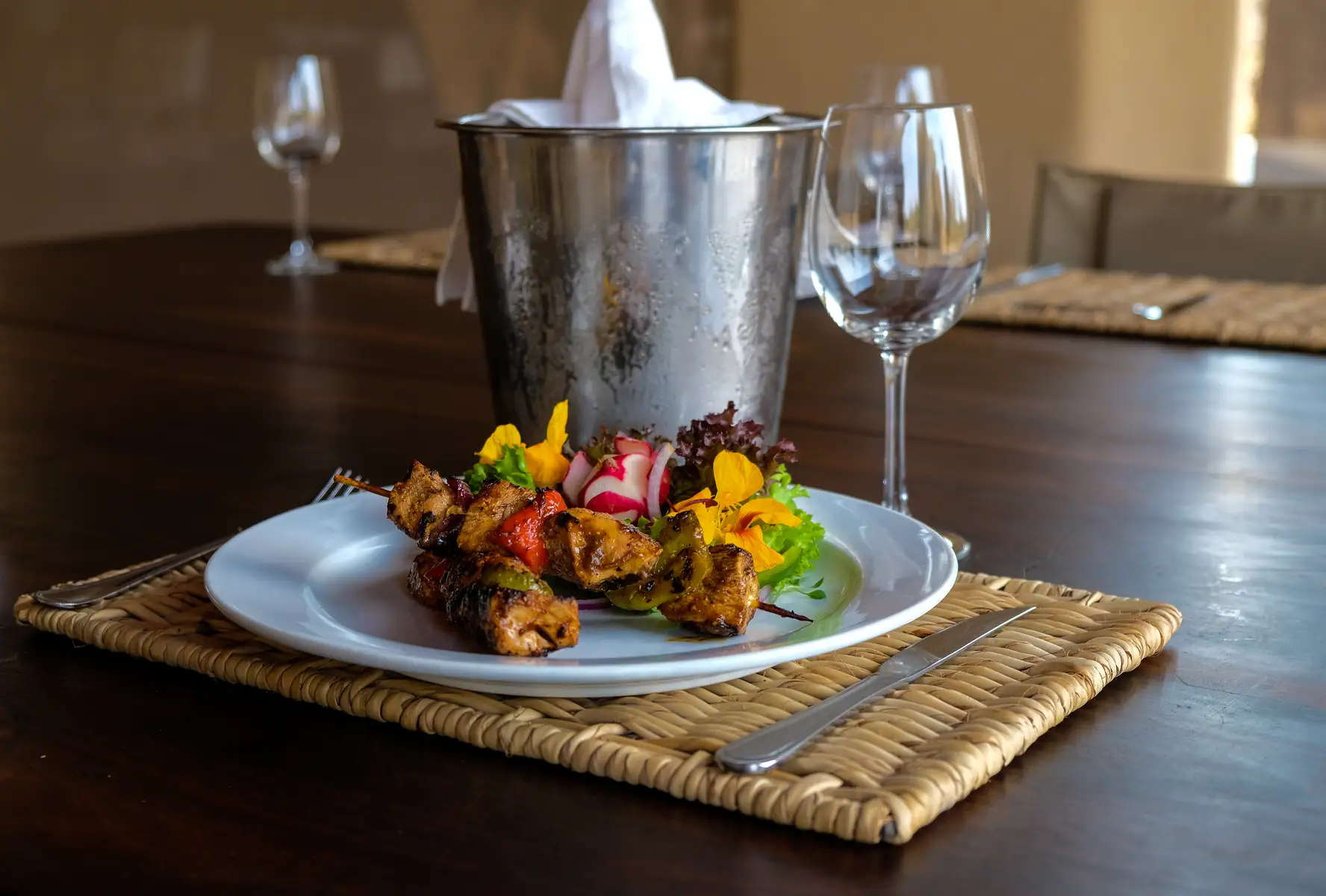 Dining at the camp is communal and usually takes place outdoors with log fires and torches. The cuisine consists of simple homemade dishes incorporating local produce. Special arrangements can be made for in-room dining and private bush dinners.