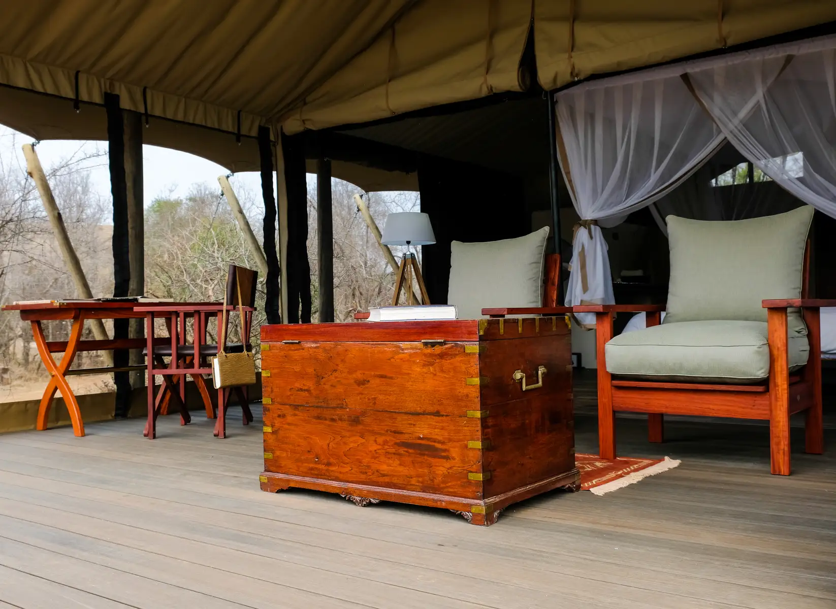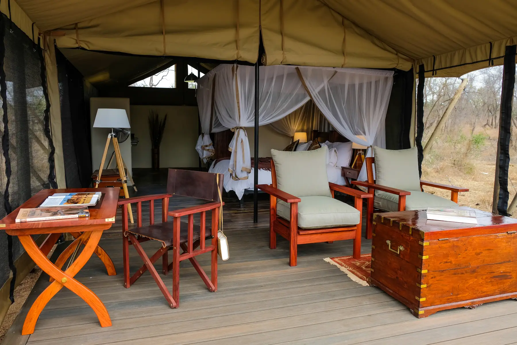 There are 12 comfortable double tents nestled in a Tamboti grove and overlooking a dry riverbed. The tents are each set on a wooden platform and are furnished with king-size beds (which can be converted into twin beds), mosquito nets, leather couches, and en-suite bathrooms featuring a sunken concrete bath, double shower, double vanity, and a separate toilet.