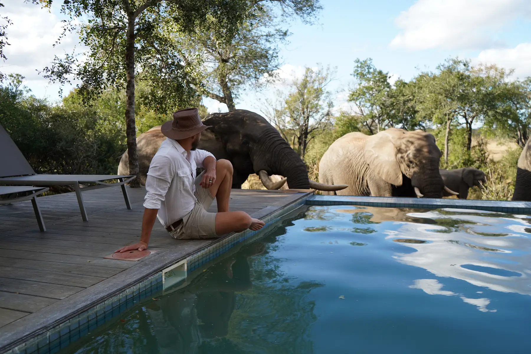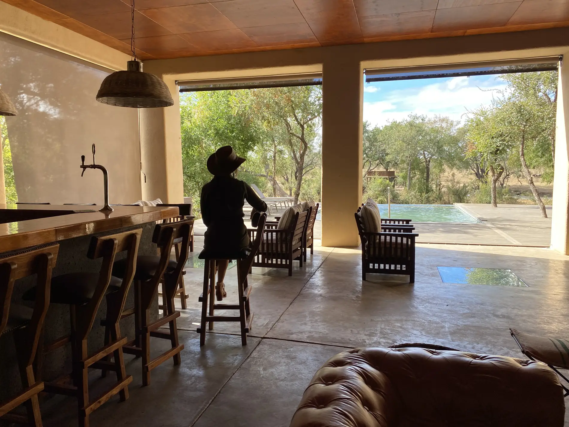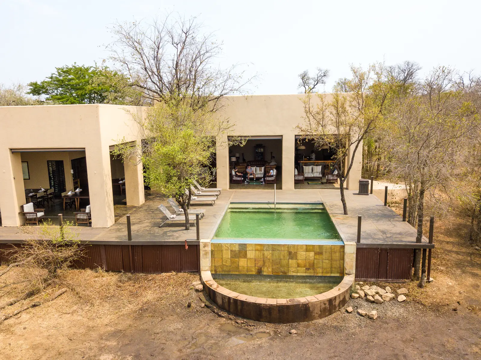 Lodge facilities include a reception area, a large sitting area, dining area, bar, an extensive climate-controlled wine cellar, swimming pool with sun loungers, and a viewing deck that overlooks a nearby watering hole.