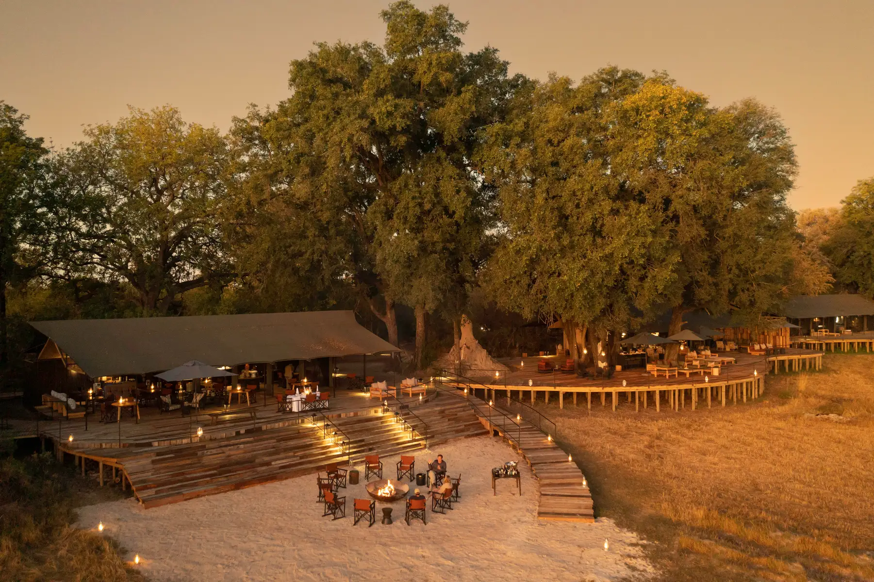 The camp’s tented suites evoke the classic 1950s safari style, featuring en-suite bathrooms, private verandas, and vintage-inspired furnishings. Days are spent on game drives, Mokoro excursions, and birdwatching, while evenings bring candlelit dinners and the sounds of the bush all around.