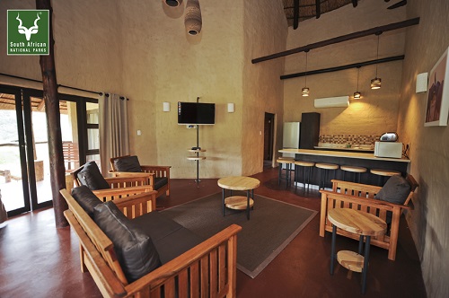 The four-sleeper Guest Cottage features a bedroom with a double bed, second bedroom with two single beds, two en-suite bathrooms.An open plan kitchen (two-plate hob) and basic utensils, fridge and microwave. Lounge, air-conditioning, DStv (limited channels). Braai area, private splash pool and deck with views across the floodplain.