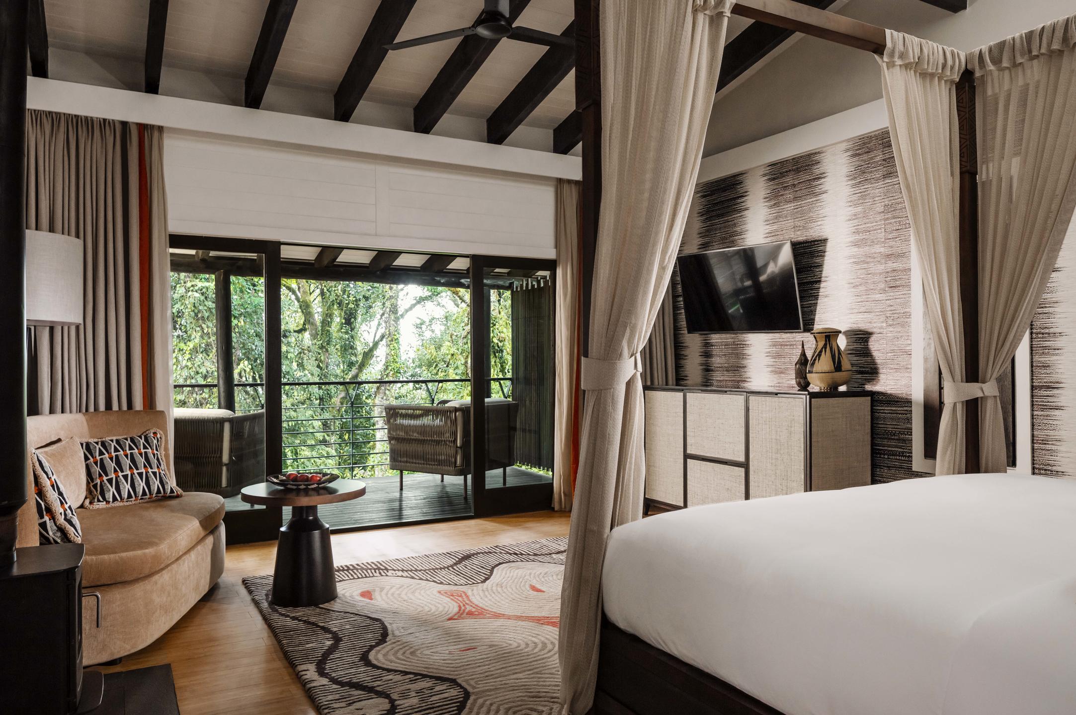 The Canopy Treehouse, ideal for couples, offers either a king-sized or twin beds, a cozy lounge area, and an expansive private balcony amid the treetops. Here, you can relax to the sounds of the forest and catch glimpses of rare birds and colobus monkeys. Your stay includes exceptional dining, select beverages, and two signature experiences each day.