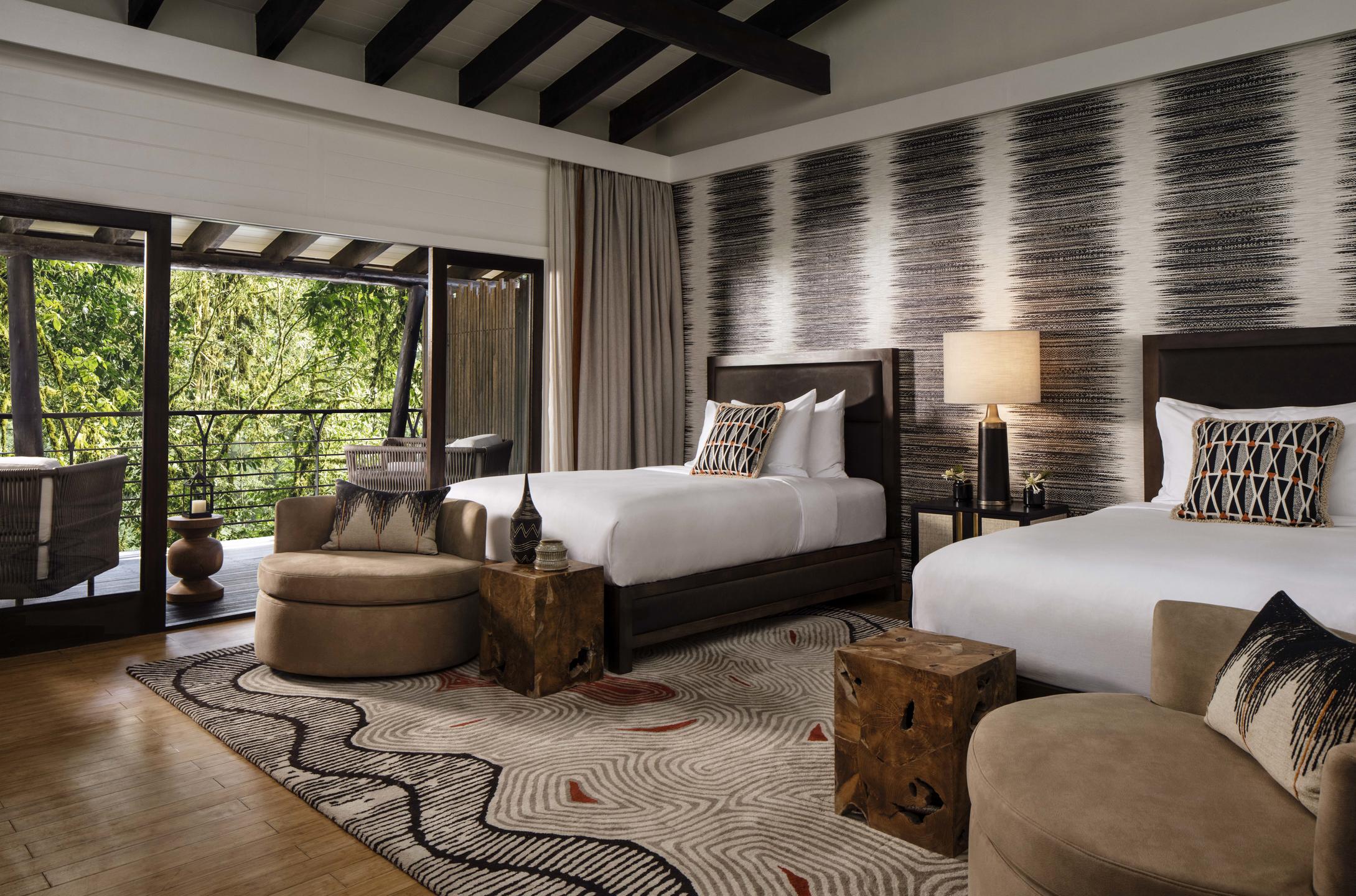 The luxurious Two-Bedroom Canopy Villa, set between dense forest and lush tea fields, provides ample space for families, friends, or larger groups. The master bedroom features a four-poster king bed, while the second bedroom has twin beds. Both rooms have wood-burning stoves, private decks, and en suite bathrooms with twin vanities, walk-in showers, and standalone baths.