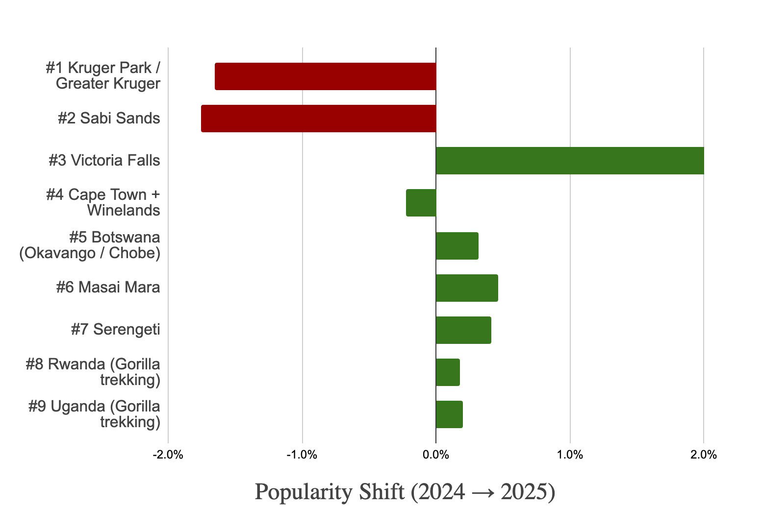 To keep things apples-to-apples, we stacked the first five months of 2024 against the first five months of 2025. The leaderboard of top regions looks unchanged at first glance—that part’s a little dull—so we dug into the movers and shakers instead. That’s where it gets interesting: Victoria Falls leapt forward, while interest in Kruger Park and the Sabi Sands eased off.