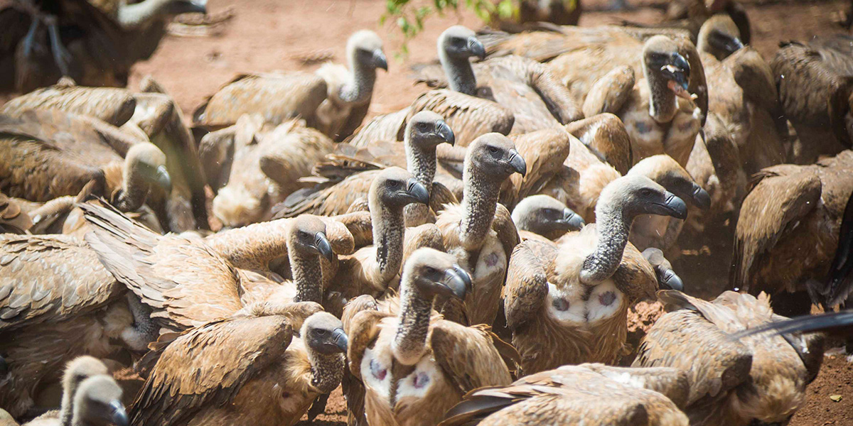 Zulu details the role of vultures in preventing the outbreak of disease as he points out the different species that have landed. White-headed, hooded, lappet-faced and white-backed vultures hunch and huddle, while three marabou storks gobble up large meaty bones in single gulps.
